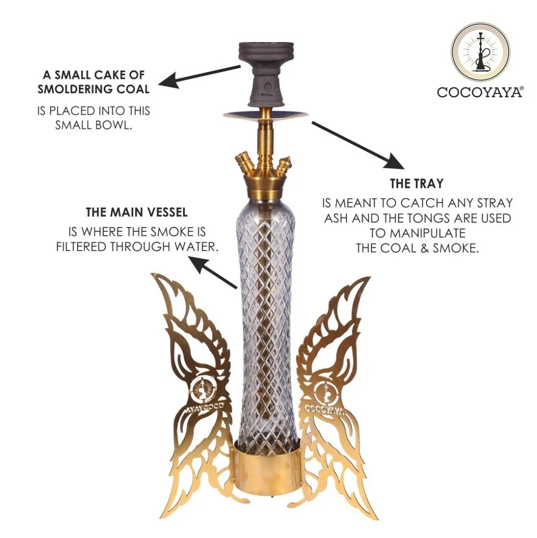 The Cocoyaya Fly Series Hookah stands 26 inches tall and is beautifully engineered with hand-cut glass, a stainless-steel stem, and intricate steel-cut wing details. Combining elegance with exceptional craftsmanship, it delivers smooth, refined sessions and makes a striking centrepiece for any space. Complete with bowl, tray, tong, hose, and grommets, this hookah offers a polished and immersive experience.